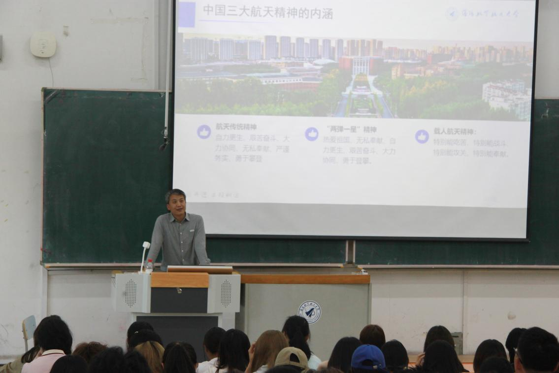 荆浩院长以航天传统精神、“两弹一星”精神、载人航天精神三大航天精神为引,带领同学们穿梭于浩瀚星空的追梦征程。当话题转向不久前奔赴太空执行任务的神舟二十号载人飞船航天员王杰学长,课堂氛围瞬间热烈起来。荆浩院长分享着王杰学长在沈航求学时的点点滴滴——他如何在实验室里日夜钻研,在训练场上挥汗如雨,以艰苦奋斗的意志打磨专业技能,用精益求精的态度雕琢航天梦想。王杰学长用实际行动诠释的航天精神,成为激励现场每一位学子的鲜活榜样。