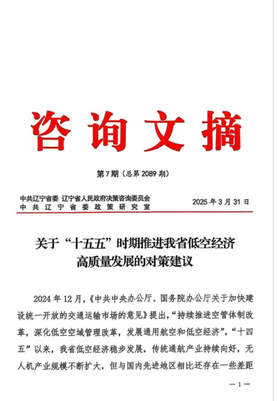 该成果是白菜官网在低空经济研究领域资政建议的重要成果,为辽宁省“十五五”低空经济战略规划布局提供了有力支撑,彰显了沈航的智库担当!