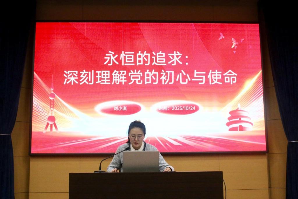第二讲“深刻理解党的初心与使命”,学生第二党支部书记刘小淇带领学员回望近代峥嵘岁月,深刻论证了党的初心使命的历史必然性,精辟剖析了“谋幸福”与“谋复兴”的辩证统一关系,并结合“两个一百年”奋斗目标,激发了学员强烈的时代共鸣与历史责任感。